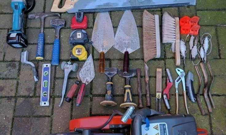 Includes nails, hammers, hoes, saws, crowbars, and other essential iron tools for building and repairs.